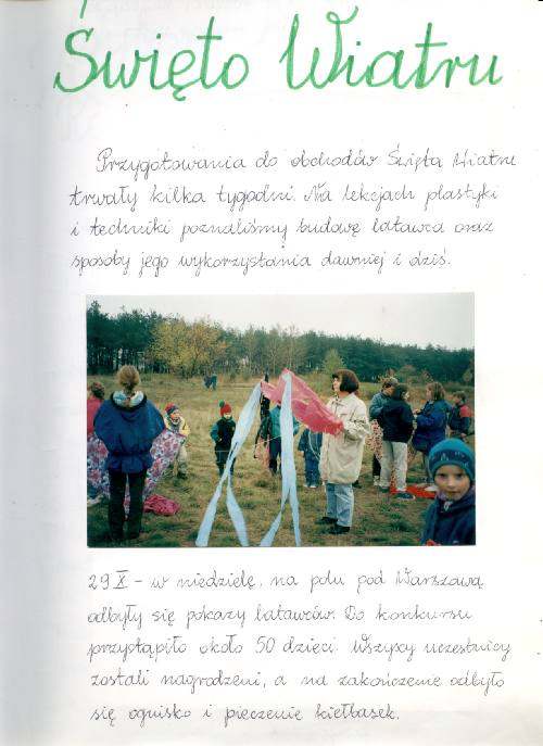 W październiku 1995 - w pierwszych miesiącach działania szkoły zorganizowaliśmy Szkolne Święto Wiatru. Uczniowie samodzielnie na lekcjach budowali latawce proste i skrzynkowe, potem także konstruowali latawce wespół z rodzinami w domu.