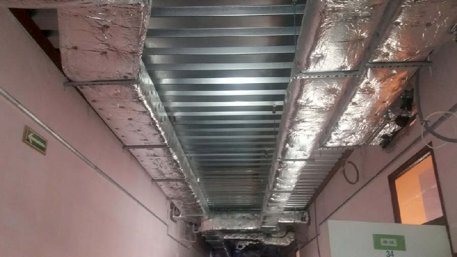 Trwają intensywne prace przy montażu kanałów i urządzeń instalacji wentylacji mechanicznej. Wykonano już całą konstrukcję nośną pod przewody i przebicia w ścianach. Tutaj napotkano na nieplanowane utrudnienia, bowiem konieczne było przeniesienie przewodów elektrycznych kolidujących z nową wentylacją mechaniczną.