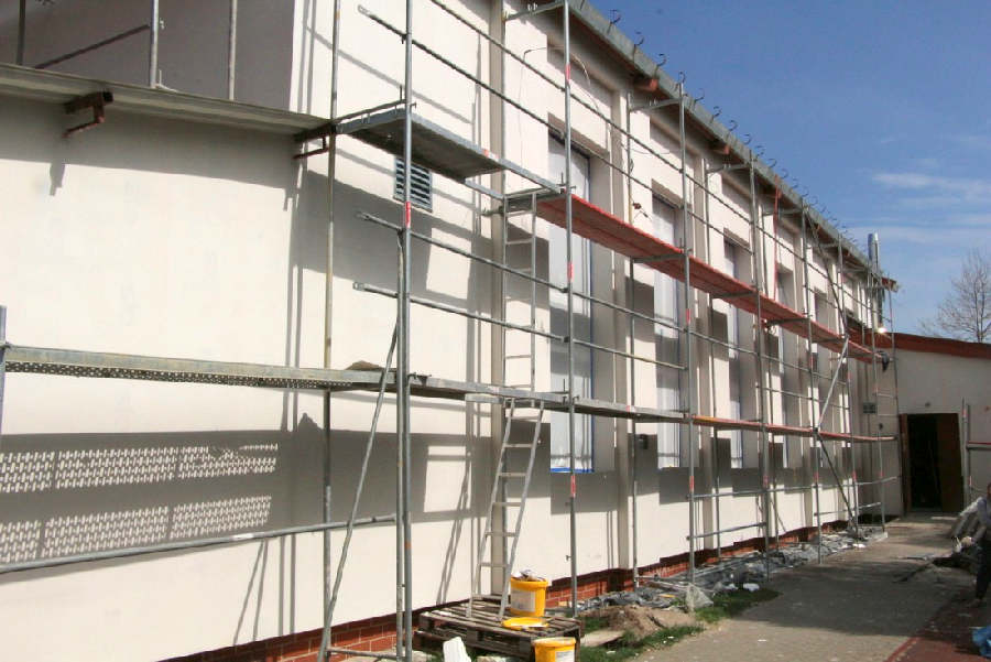 Stopień zaawansowania przy wymianie okien w budynku osiągnął około 70%. Trwa uzupełnianie ocieplenia glifów wokół okien i wykonanie drugiej warstwy osiatkowania i wyprawy elewacyjnej.