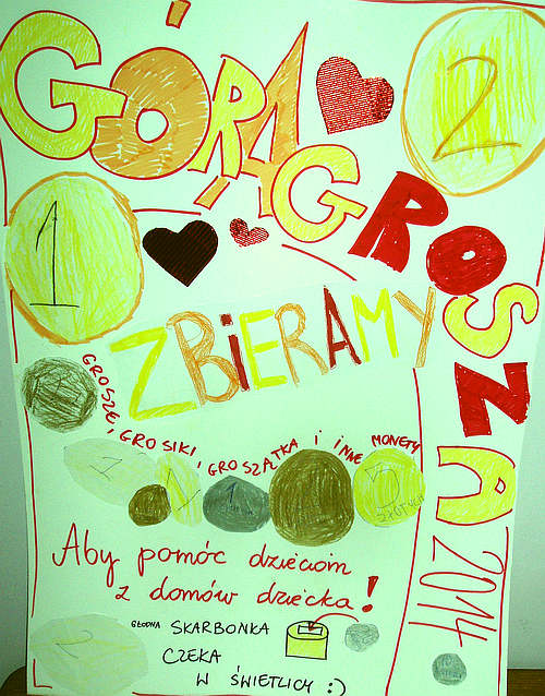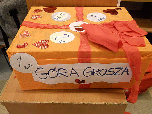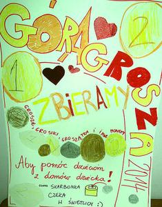 Akcja "Góra Grosza" w naszej szkole znów! Teraz w grudniu 2016! Zbieramy małe pieniążki, grosiki tak samo jak we wszystkich bratnich szkołach w całej Polsce. Grosiki będziemy przekazywać na rzecz dzieci z Domów Dziecka. Nasi najmłodsi uczniowie skleili nową piękną skarbonkę z tekturki i ustawili ją w świetlicy. Uczniowie z grupy wolontariuszy w tym roku nie przychodzą z puszką do klas i nie kwestują. Po prostu chętni ze zbytecznymi groszakami odwiedzić powinni świetlicę i sami zapytać o skarbonkę...